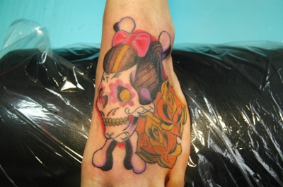 SATOSHI TATTOO★sugar skull★ SATOSHIです!!お次はシュガースカルで~す!こっちは以前彫ったシュガースカルの対になるように女ビリーなスカルでっす!結構カッコかわいい感じになって自分的にも好きなデザインです★でも甲はほんと痛そうですねぇ…… Tweet