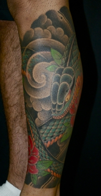 こんにちは。龍一郎です。今日の作品は和彫りの大蛇と牡丹です。お客さんの希望で膝下のみの額です。