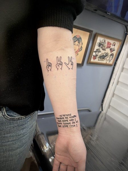 ハンドサインのタトゥーです。 可愛い感じに仕上げました! 手首にはタイプライター文字のレタリングです(^^)