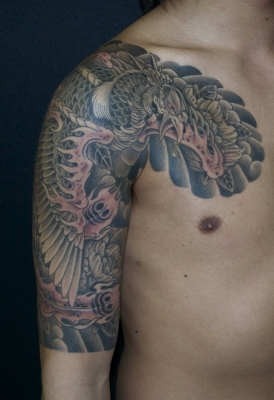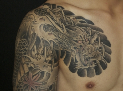 こんにちは。龍一郎です。今日は青梅市からお越しのK君の和彫りの龍と登竜門です。