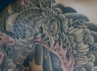 こんにちは。龍一郎です。今日は青梅市からお越しのY君の和彫りの朱雀です。