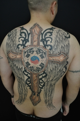 今回の作品はクロスと羽のタトゥーです。