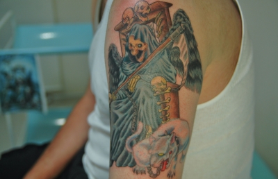 おはようございま~す★今日は昨日の夜遅くまでかかったTATTOOをご紹介します!!死神で~~す!!死刑台??の椅子に座って愛犬までいるというこのどっしり感!すばらしく悪いですね~★実は服のしわでひざにもスカルができているんですが…気づきました??スカルづくし!!!